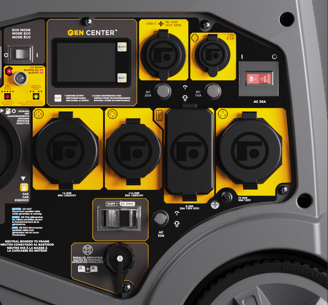 It operates at a quiet 67 dB (¼ load) and features a 120/240V output, making it RV ready and storm-ready. The outlet panel includes a 50A 120/240V (14-50R), 30A 120V RV (TT-30R), 30A 120/240V twist-lock (L14-30R), and even USB-A and USB-C ports for direct device charging.