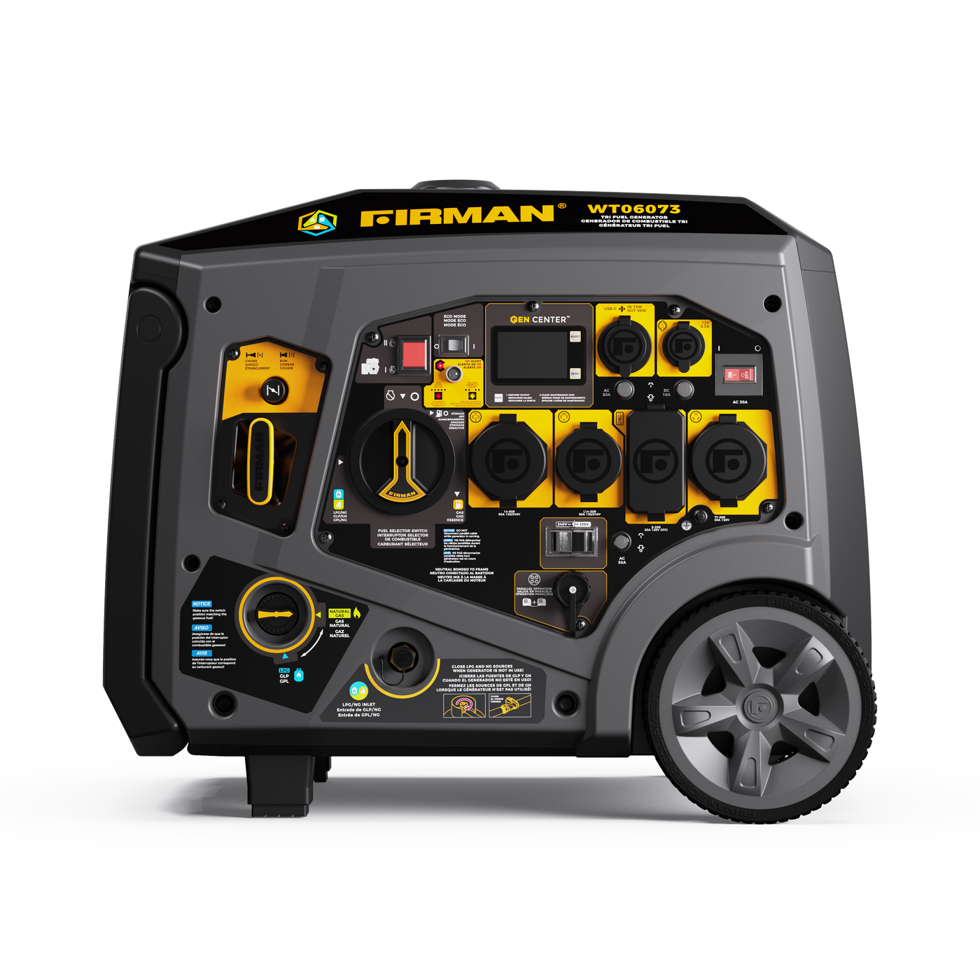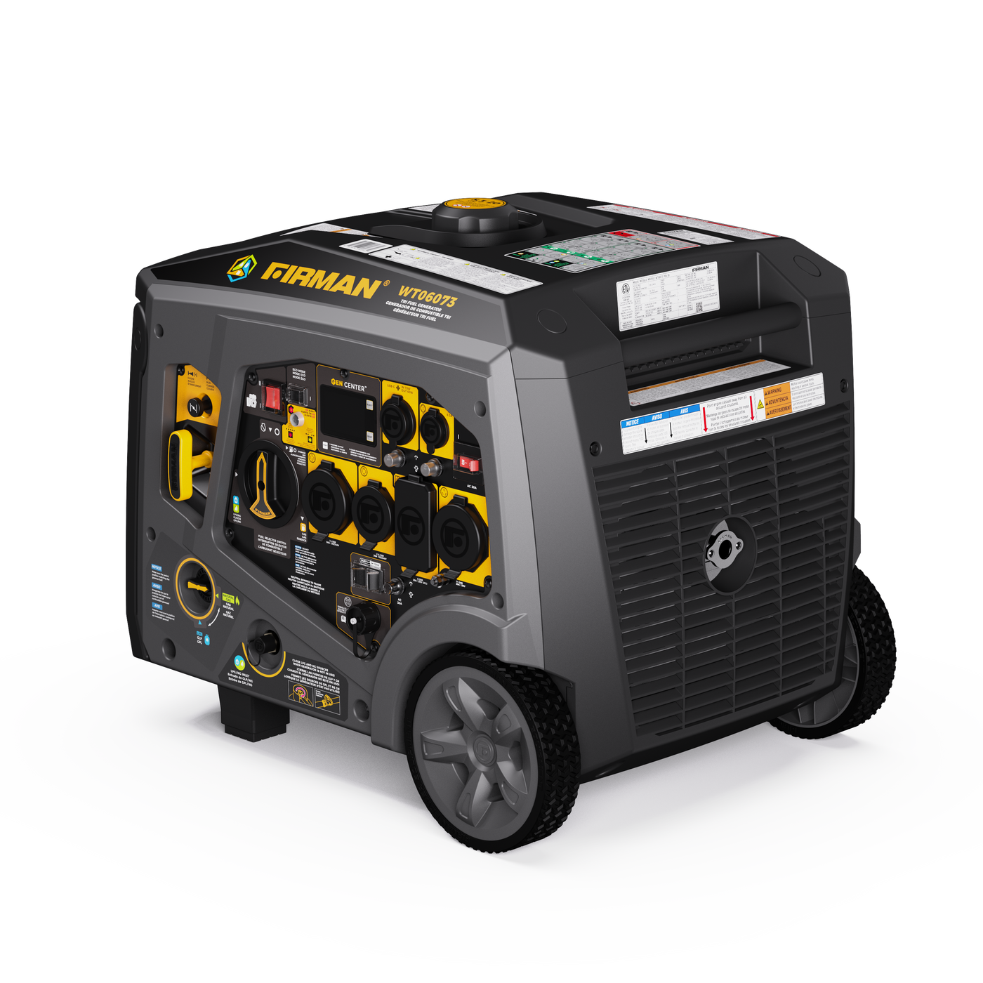 When the power goes out, the job site pushes limits, or your RV takes you off the grid, the FIRMAN WT06073 Inverter Generator answers the call. With a peak of 7500 starting watts and 6000 running watts on gasoline (6750/5400W on LPG, 5600/4500W on natural gas), this tri-fuel generator offers unmatched flexibility and performance. Run it on gas, propane, or natural gas, whichever suits your needs best.