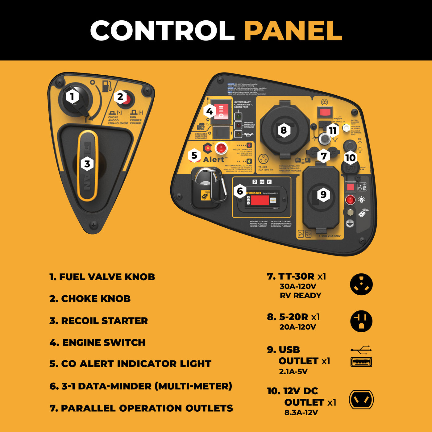 Multi-featured control panel with covered outlets